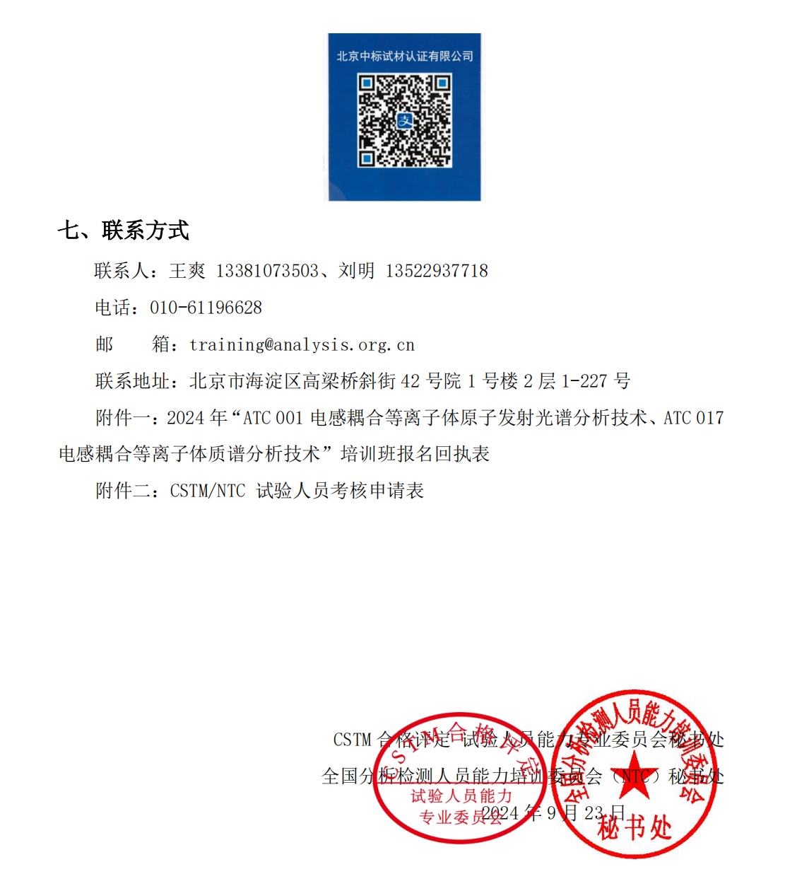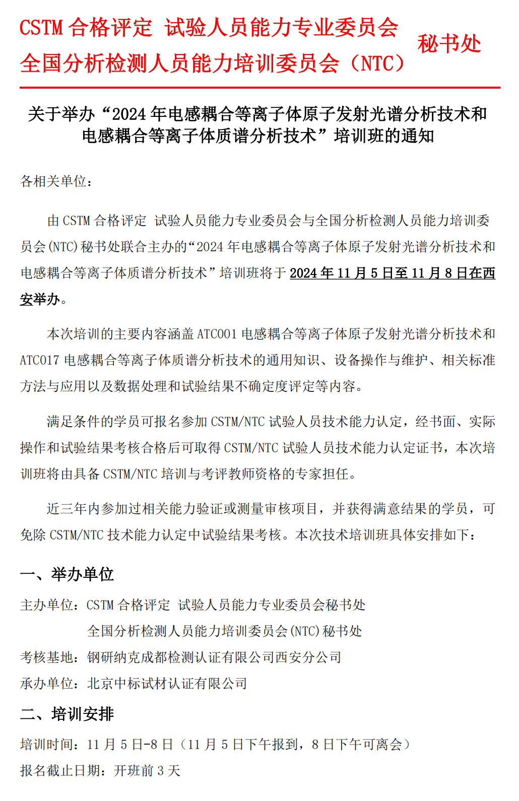 关于举办“2024年电感耦合等离子体原子发射光谱分析技术和 电感耦合等离子体质谱分析技术”培训班的通知