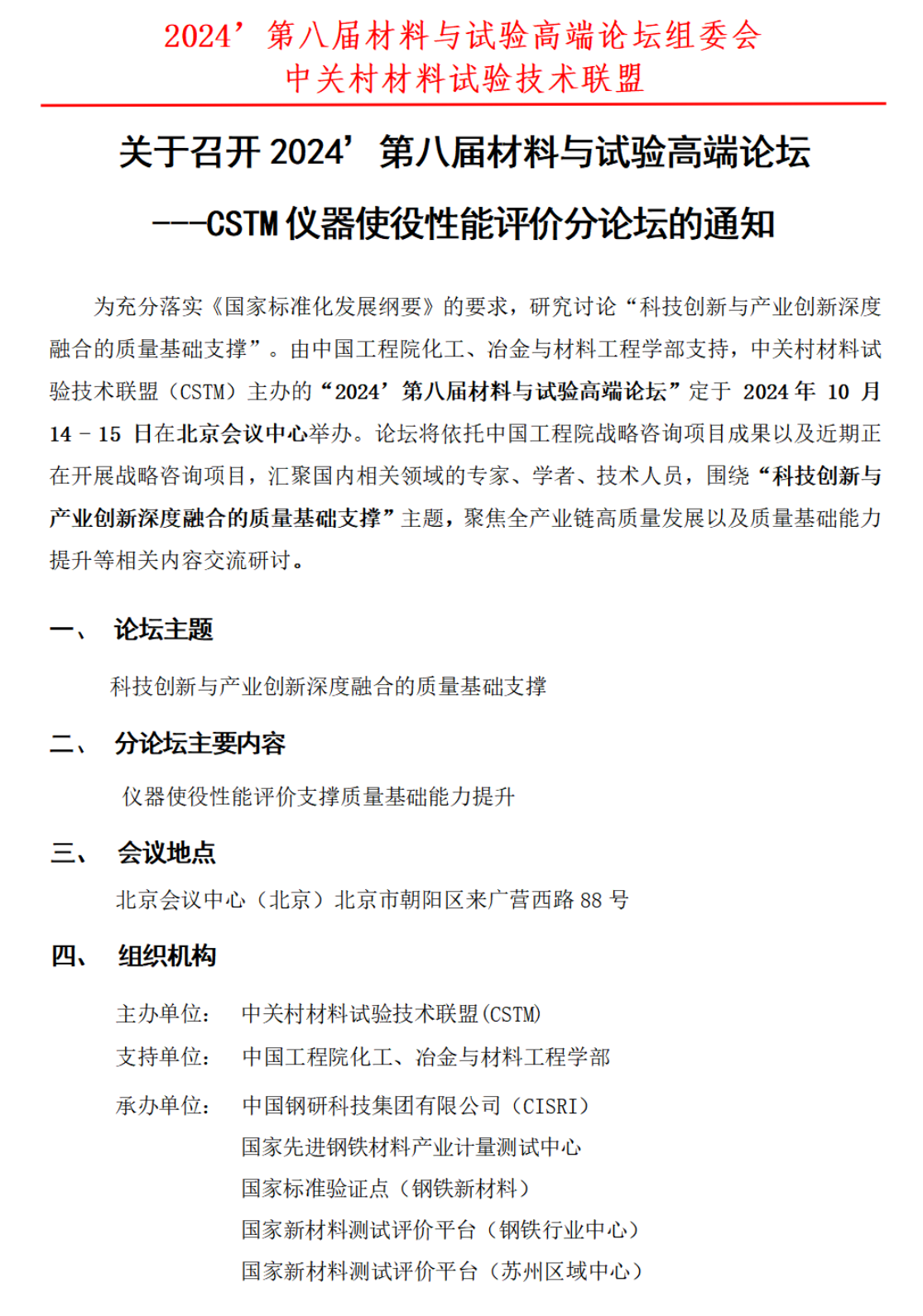 关于召开2024’第八届材料与试验高端论坛---CSTM仪器使役性能评价分论坛的通知
