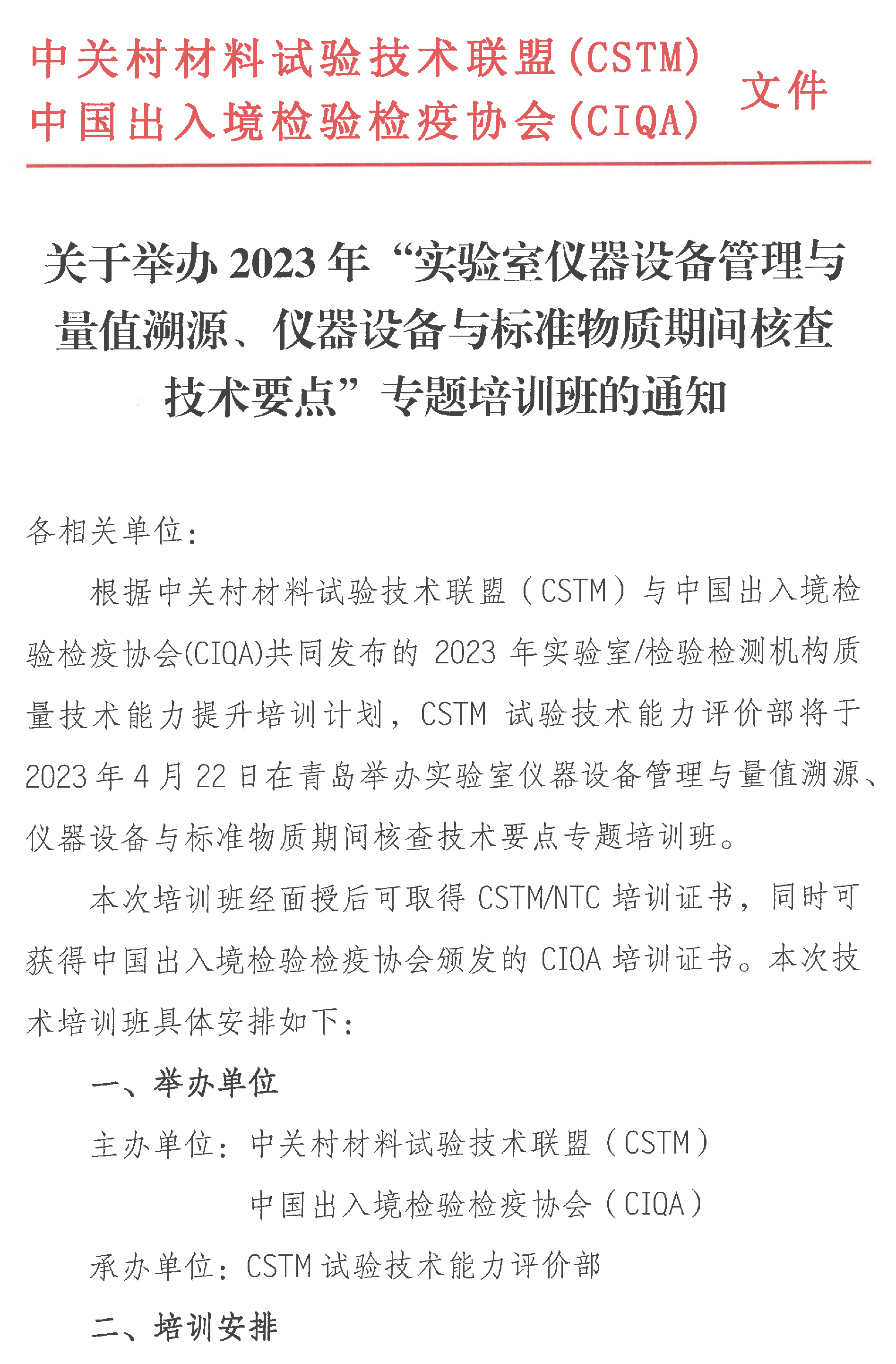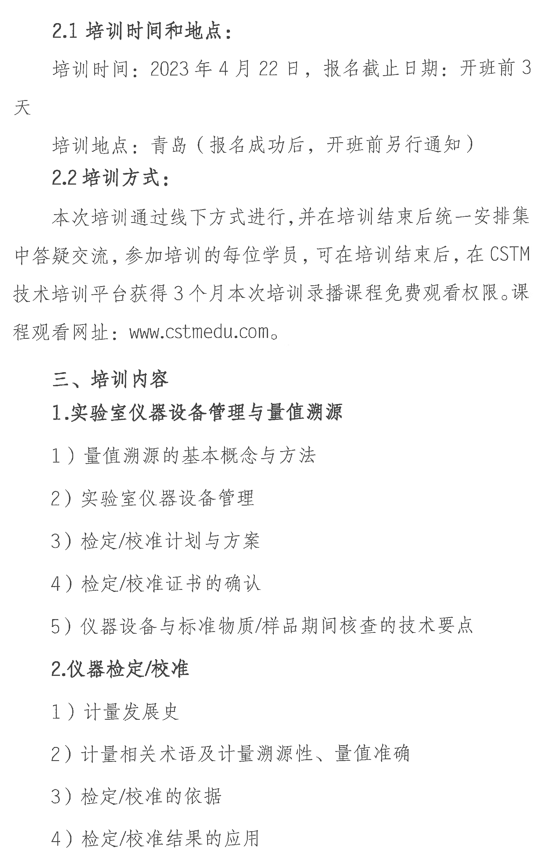 关于举办2023年“实验室仪器设备管理与量值溯源、仪器设备与标准物质期间核查技术要点”专题培训班的通知
