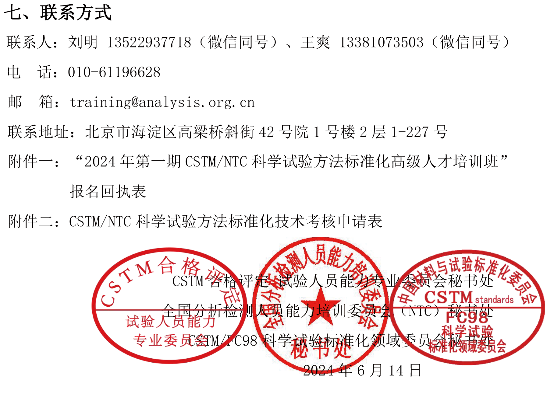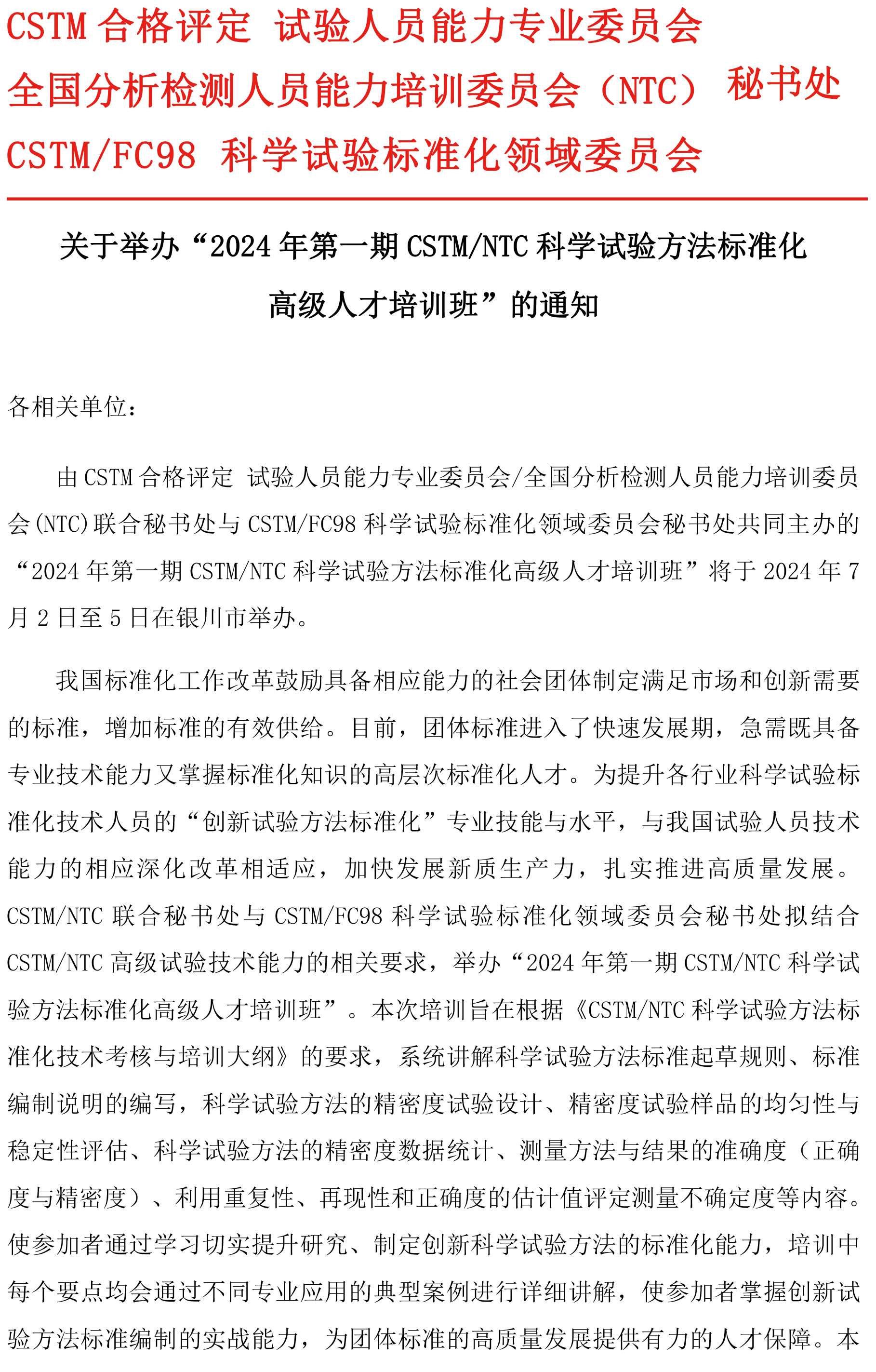 关于举办“2024年第一期CSTM/NTC科学试验方法标准化 高级人才培训班”的通知