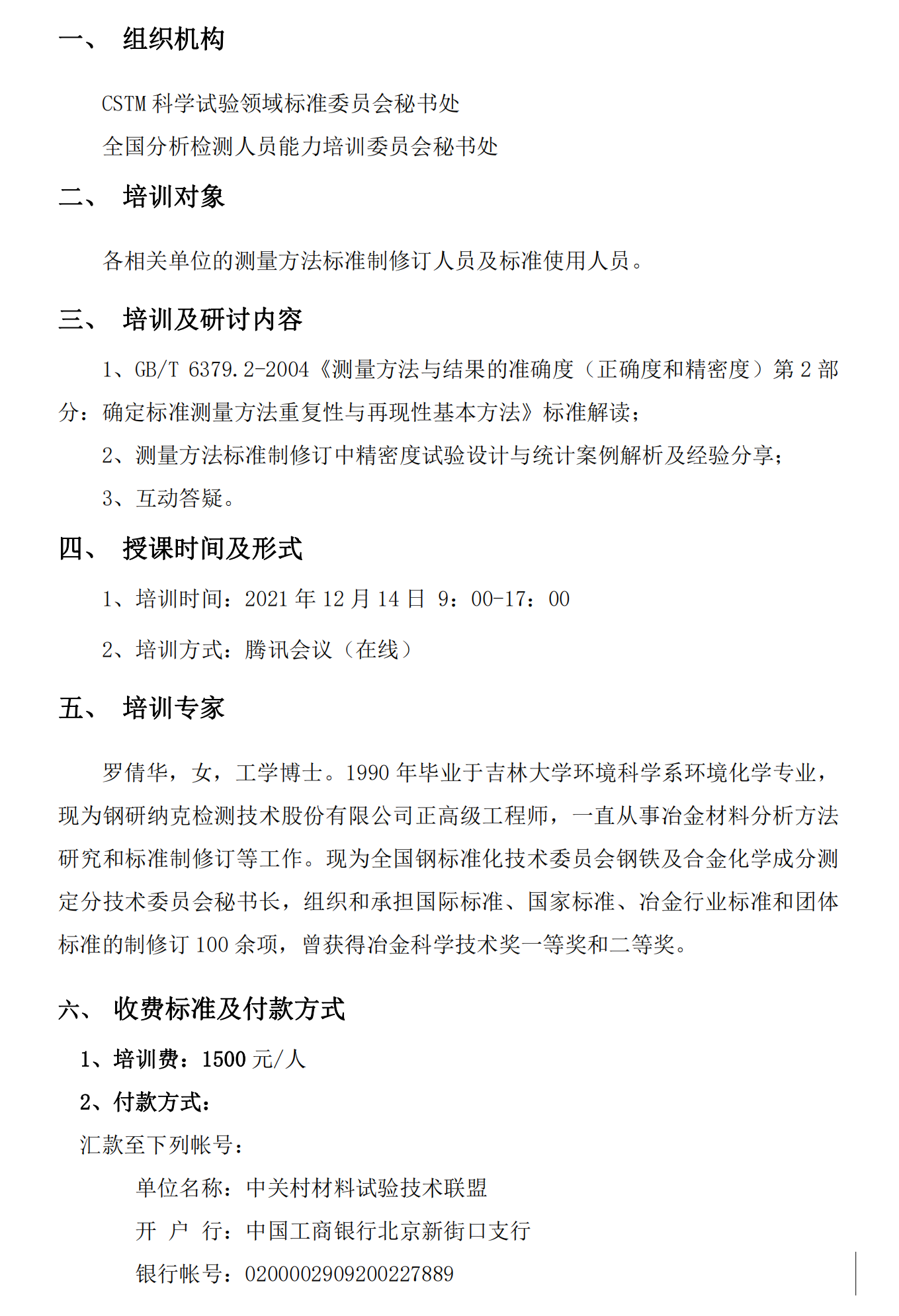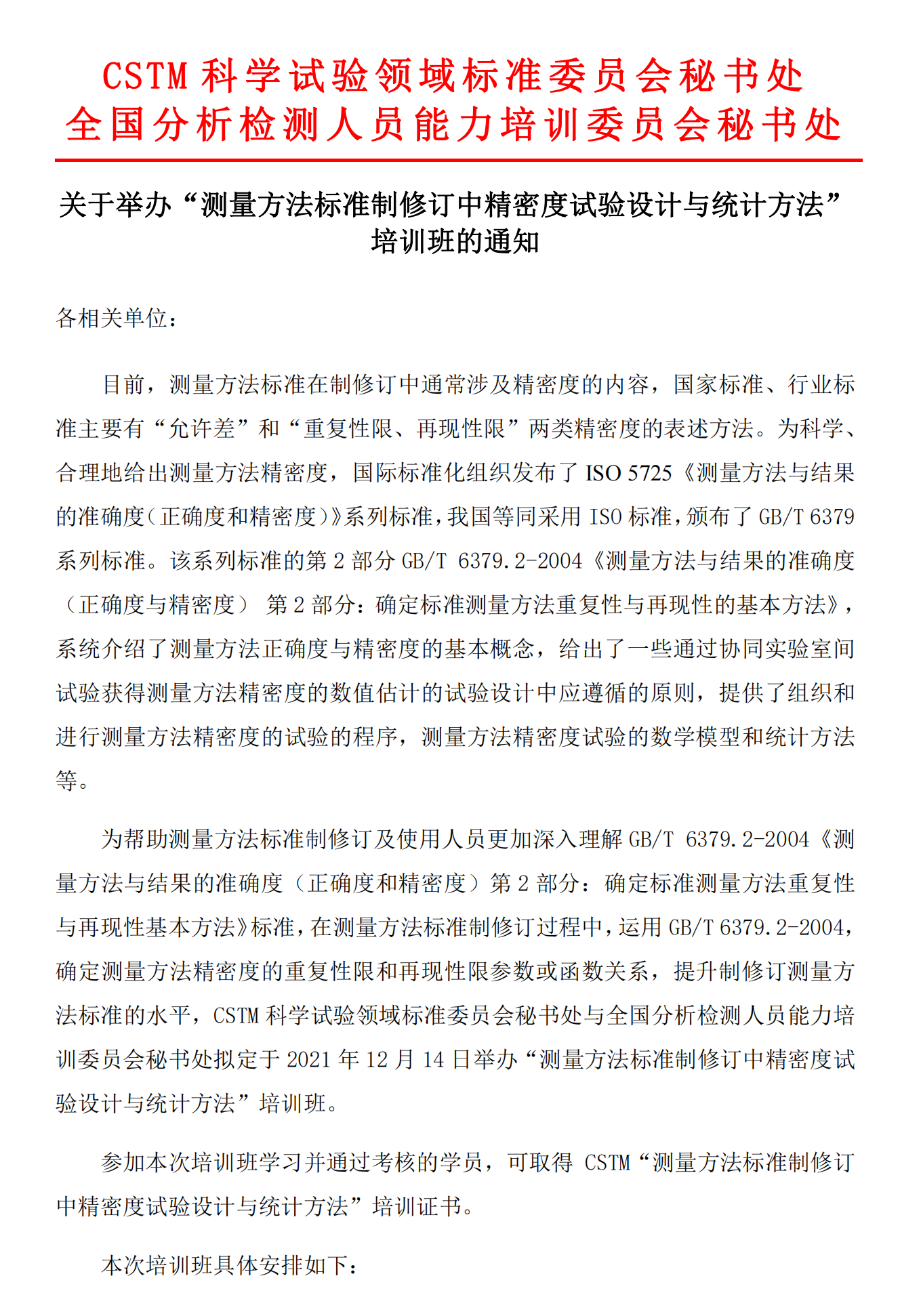 关于举办“测量方法标准制修订中精密度试验设计与统计方法” 培训班的通知