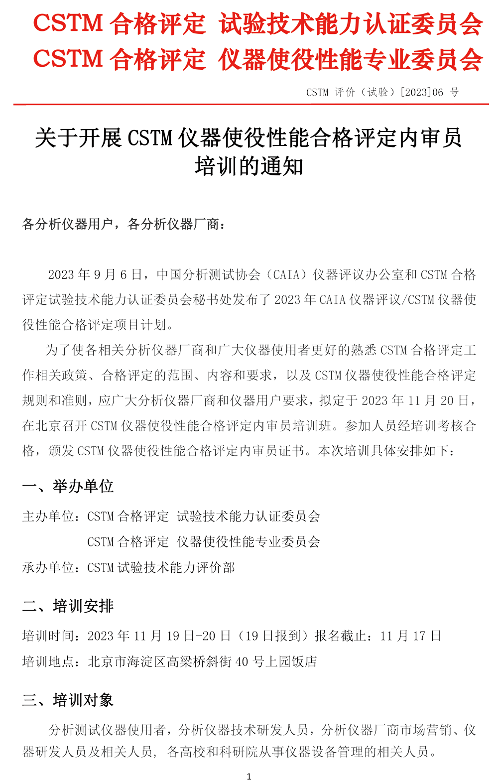 关于开展CSTM 仪器使役性能合格评定内审员培训的通知