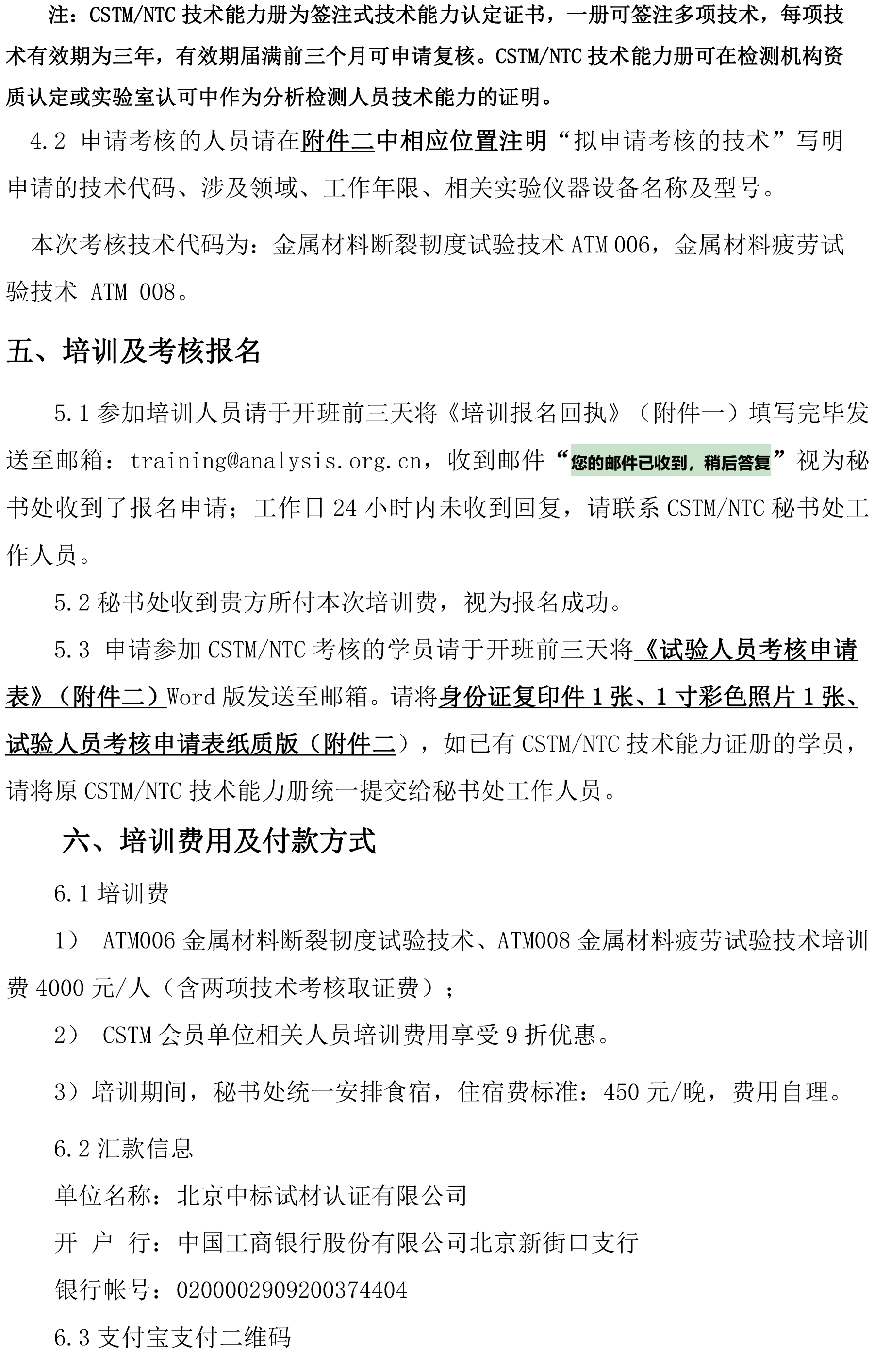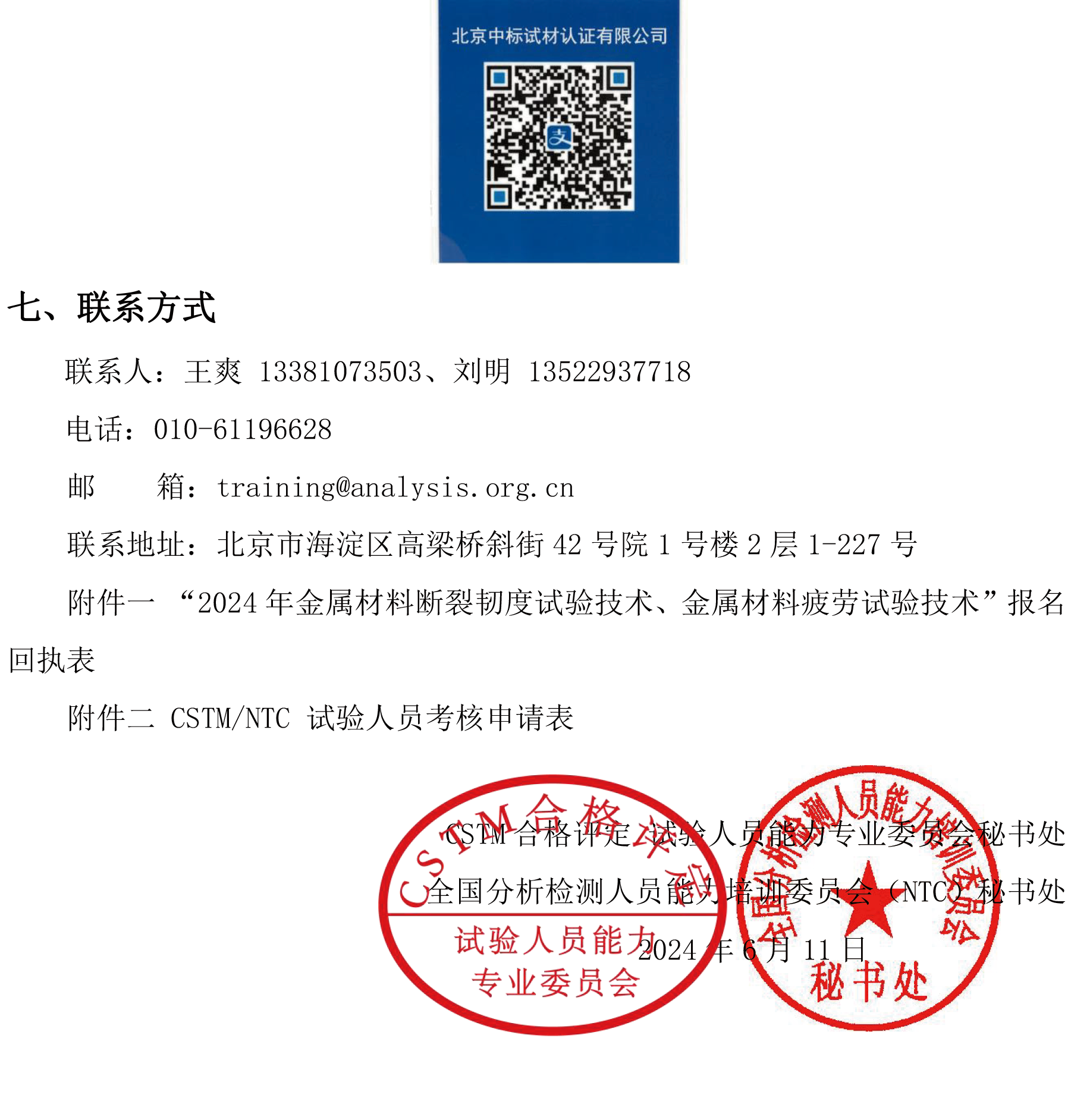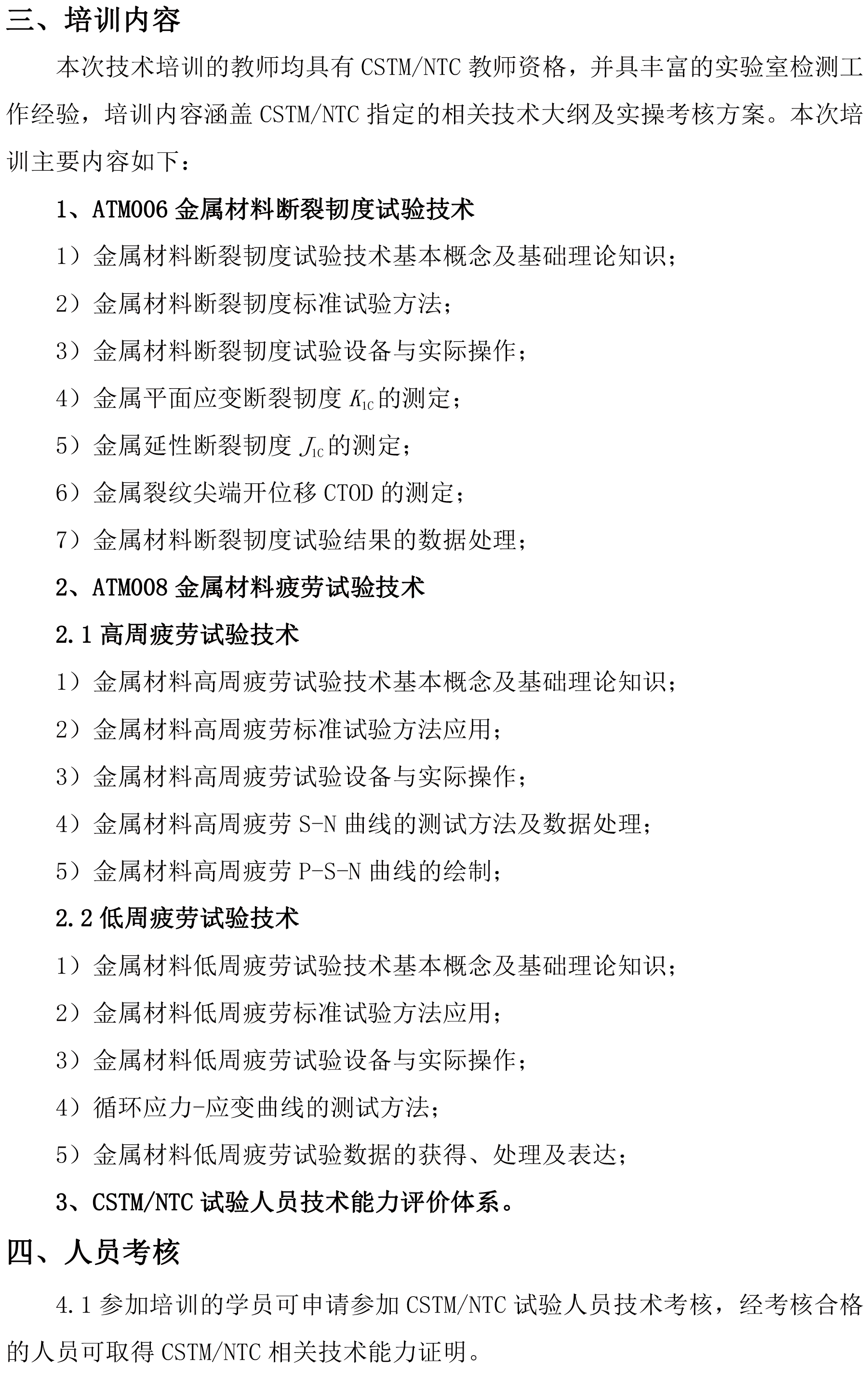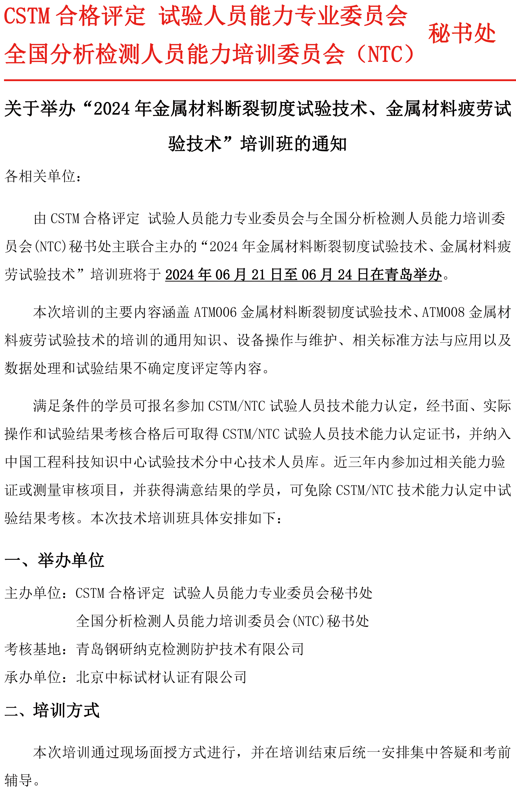 关于举办“2024年金属材料断裂韧度试验技术、金属材料疲劳试验技术”培训班的通知